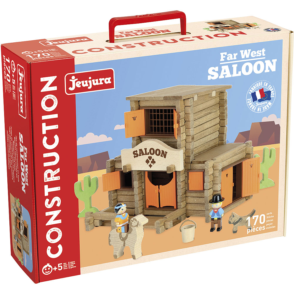 The wooden construction set with Wild West scenery will become a decoration for the children's room. Jeujura Constructions building sets have a long tradition and are among the classic French toys. It offers a series of thematically dedicated to cottages, houses and farms, as well as the Wild West and the Middle Ages. They can be freely combined with each other, and a range of accessories, figures and vehicles are also available for many of them. They are made in France from solid beech and pine wood of French origin. The parts are treated exclusively with water-based paints and varnishes. Each set is packaged in a practical cardboard case printed with plant-based inks, and the package includes easy-to-understand instructions. Main features: 170 pieces of solid wood and a basepractical packagingmade in France