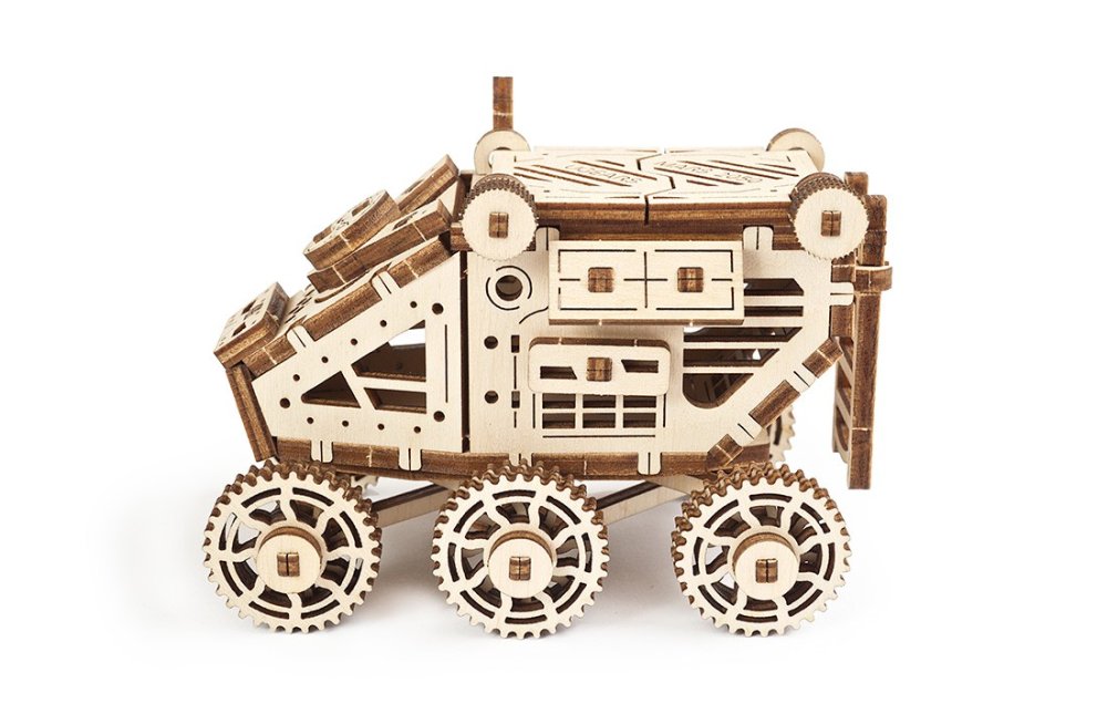 Become explorers. A plywood construction kit of a Mars rover. It won't overwhelm you with its complexity, and younger children can be invited to assemble it under supervision. The mechanics of the model will spark their curiosity. The rover is steerable and offers storage space that can be used for figurines or other small items. Equipped with a detailed assembly manual. Main features: 95 precisely cut pieceslow difficulty of assemblystorage spacethe resulting model is steerabledesigned and manufactured in Ukraine