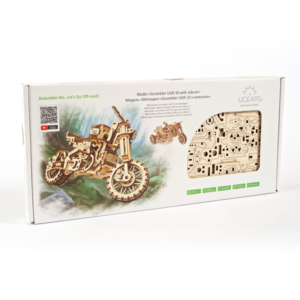 Venture off the beaten path. A plywood scrambler motorcycle construction kit with a sidecar. The model is realistically equipped with a stand, so you can display the machine separately, even without the carriage. The mechanics are elaborated in detail, so you can observe the movement of the engine pistons. The motorbike is steerable and, thanks to the wind-up mechanism, it is capable of driving, travelling up to 3 m on a single wind. It is wound and released with specially designed keys. The suspension of both forks contributes to the driving dynamics. Organise races with other UGEARS models! Equipped with a detailed assembly manual. Main features: 380 precisely cut piecesmedium difficulty of assemblySuspended forksthe resulting model is steerable and capable of independent drivingdesigned and manufactured in Ukraine